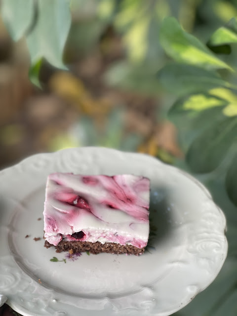 - מניחים בעזרת כף מרוטב האוכמניות בנקודות שונות על מלית הגבינה ומערבבים מעט בעזרת סכין על מנת ליצורשיוש.